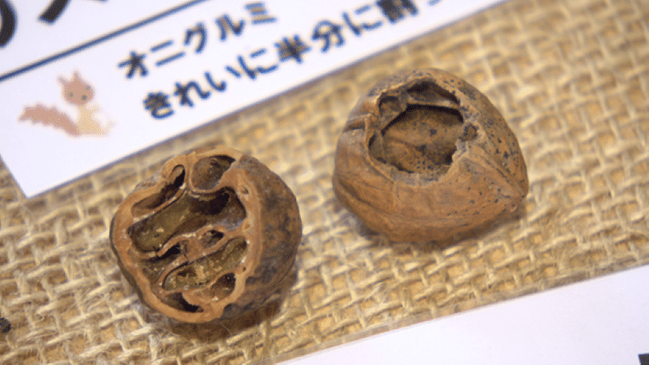 「リスは半分に割って中をかじる。ネズミは横に穴を空けて食べる。食べた痕によって、どの動物が食べたかわかる」と教えてくれました。