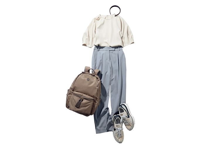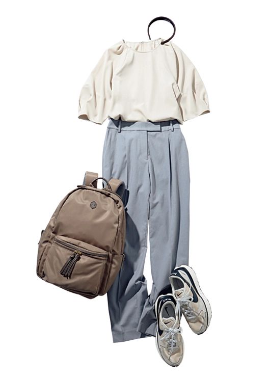 ブラウス¥9,900/グリーンレーベル リラクシング(ユナイテッドアローズ グリーンレーベル リラクシング ルミネ有楽町店) ジレ×パンツSET(パンツ)¥12,000/PLST リュックサック¥15,950/ペルケ(アンビリオン) ベージュスニーカー¥13,530/ナイキ スポーツウェア(NIKE) カチューシャ¥22,000/アレクサンドル ドゥ パリ(アレクサンドル ドゥ パリ GINZA SIX店)