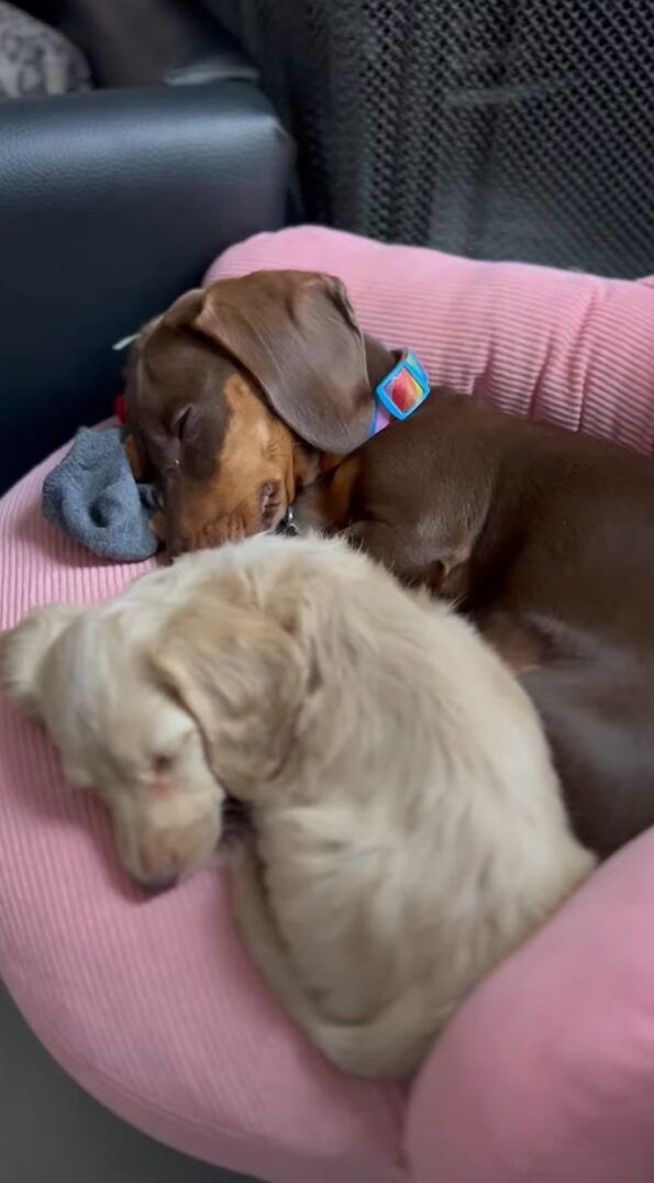 寄り添ってお昼寝をする、仲良しなダックスフンドたち。 まるで姉妹のようにハグし合って眠る様子にはほっこりです!