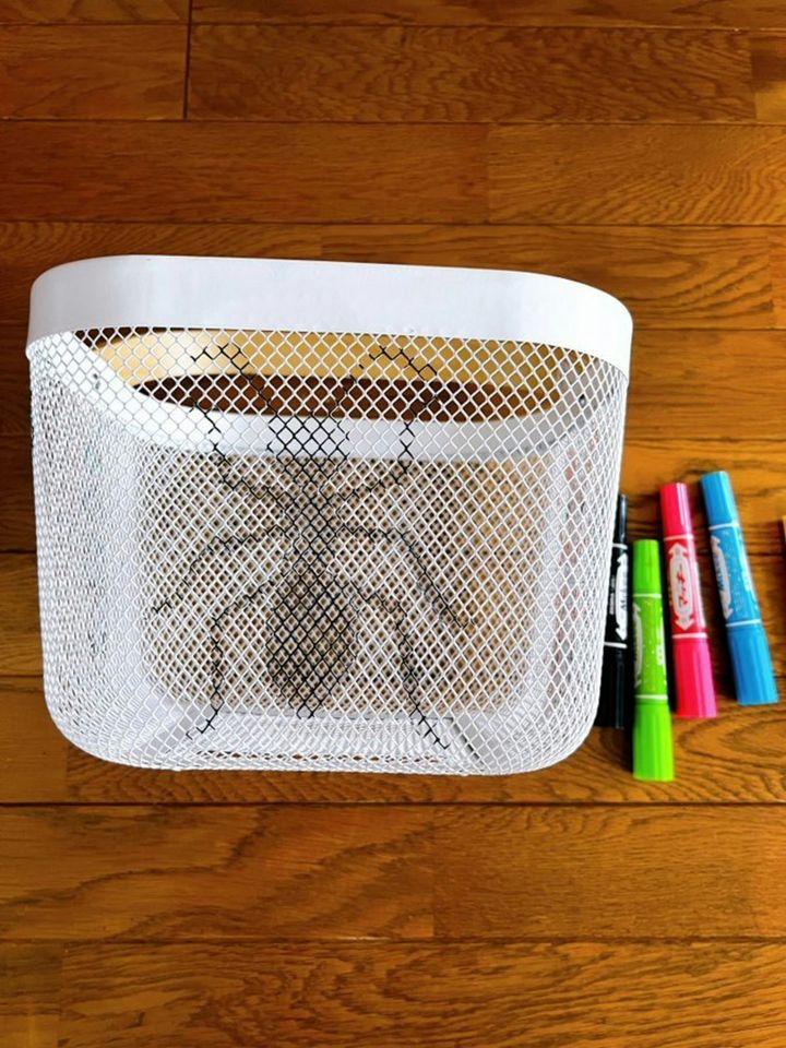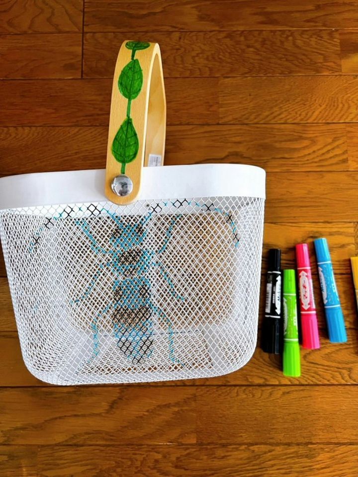白い網目状のバスケットに描かれたのはカラフルな虫や蝶。持ち手には葉っぱが描かれて、まさに「好き」があふれたバスケットですよね。夏休みの宿題を入れるために作ったそうですが、捨てる予定だったバスケットがこんなに素敵に変身するとは驚きです。