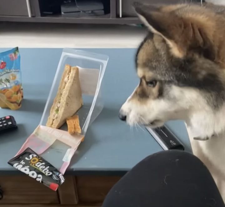 サンドイッチを見つめている犬さんの姿が。