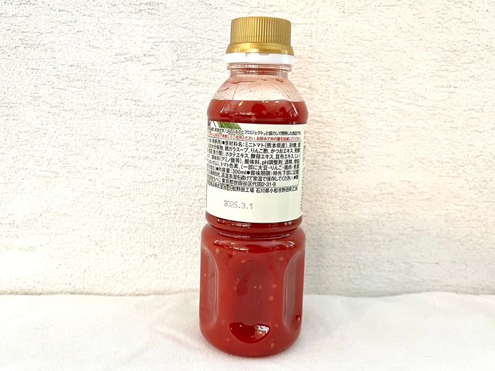 気になる原材料は…熊本県産のミニトマト、砂糖、食塩、鶏がらスープ、りんご酢、かつおエキス、発酵調味料、魚醤(魚介類)、ホタテエキス、昆布エキス、しいたけエキスなど…鶏、かつお、ホタテやシイタケをはじめとした旨味を含んだエキスをふんだんに使用しています。