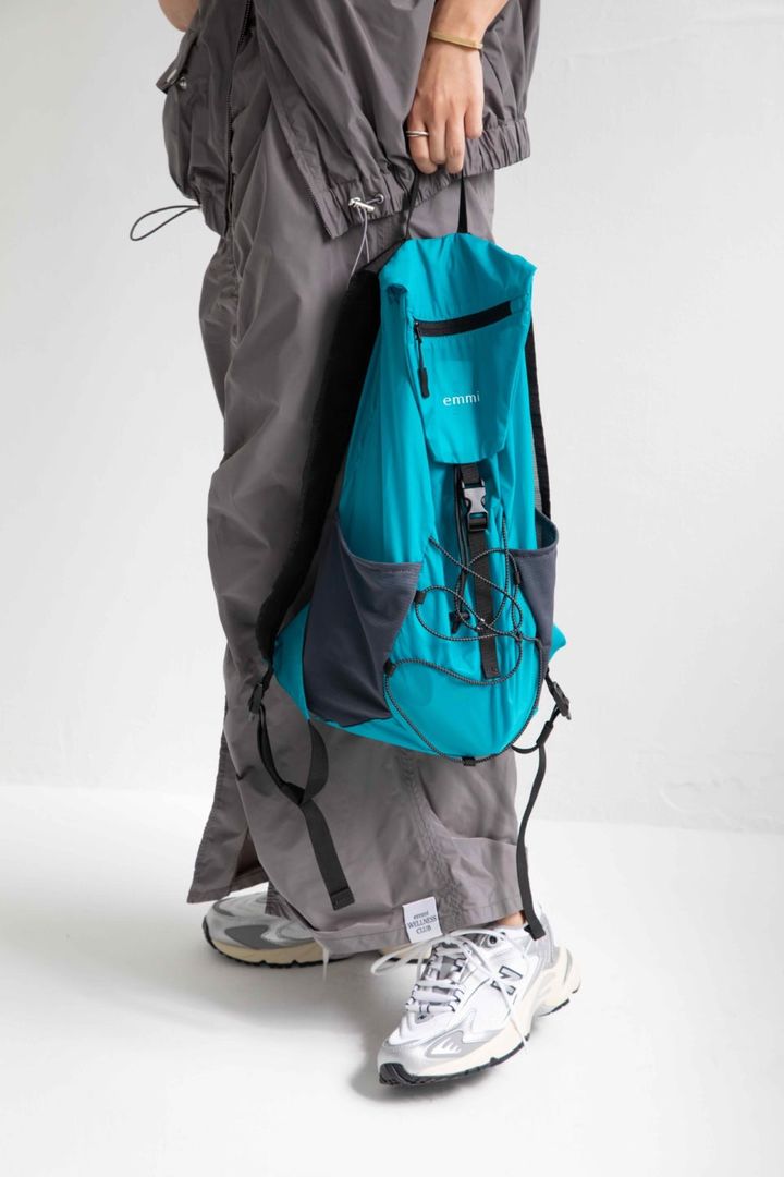 「軽量でパッカブル可能なバックパックは、アウトドアやデイリーにさくっと持てる強い便利なアイテムで、伸縮性のあるメッシュポケットはボトルなどを入れるのにぴったり。リップ生地には撥水機能も搭載しています。スニーカーは、ニューバランスの2000年代のランニングスタイルからインスピレーションを得たデザインの〈725〉の新色、シルバーカラーをチョイス」バックパック¥9,680(エミ)、シューズ¥14,080(ニューバランス/共にエミ)