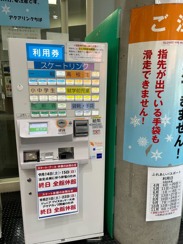スケートはまずは入口前の券売機でチケットを買い、入場。