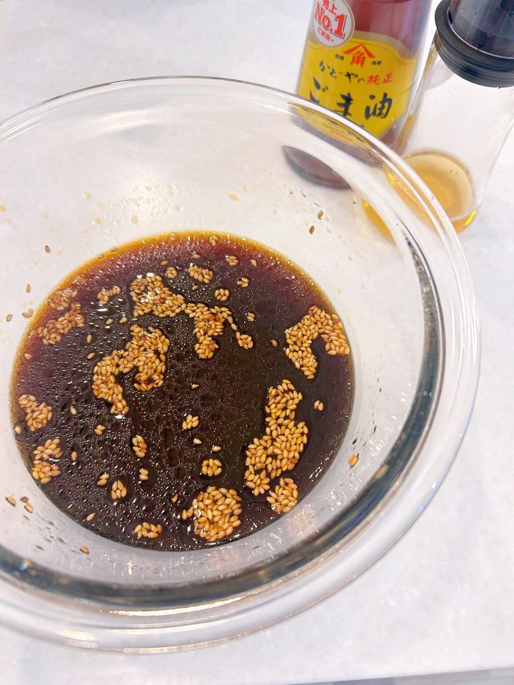 自家製きゅうりのキューちゃん風漬物には醤油やお砂糖がすでに入っているので、この残った煮汁にお好みの量のお酢とごま油、白いりごまを混ぜるだけ♪あっという間にできます!