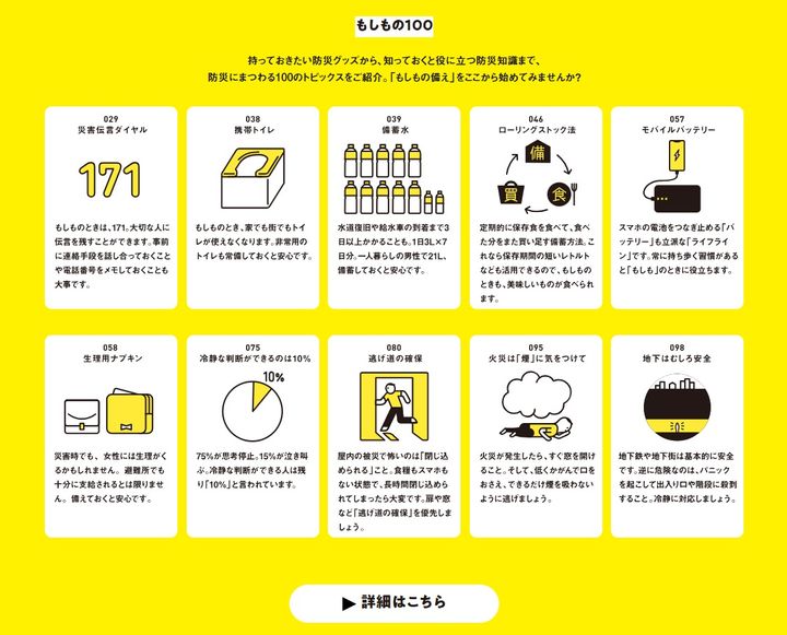 「もしもの備え」として持っておきたい防災グッズから、知っておくと役に立つ防災知識まで、防災にまつわる100のトピックスをご紹介している「もしもの100」。https://moshimo-project.jp/contents/t8bj00bi-9