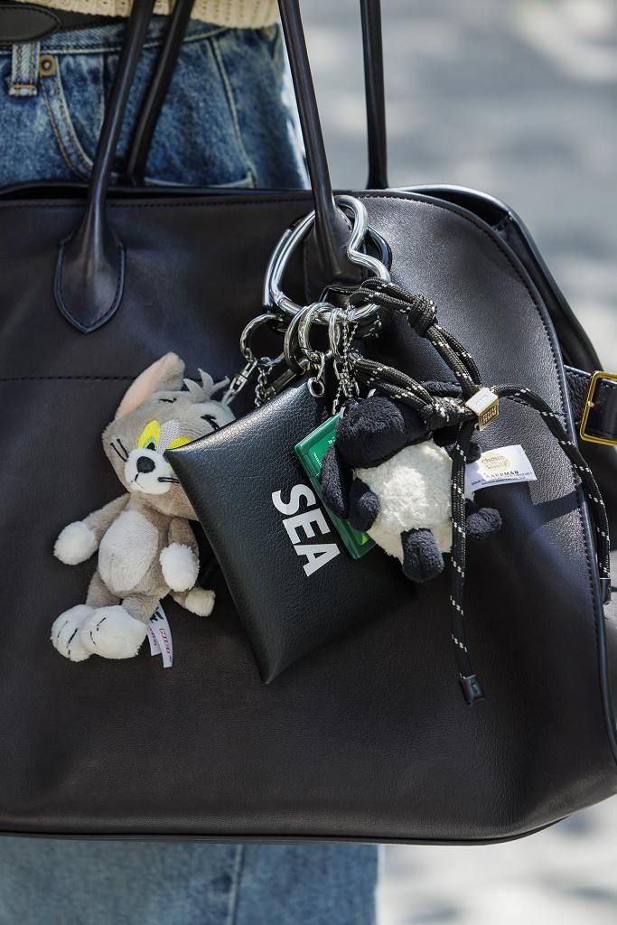 じゃらづけは好きですが、ハズしすぎないよう、色使いで調整するようにしています。トムやひつじのショーンのティミーは、キャラクターでも主張しすぎないところがお気に入り。miumiuのコードブレスもあえて黒を選びました。ネット素材が可愛いプチプラトップスにカービーデニムのワンマイルスタイルも、じゃらづけバッグのおかげで新鮮に感じます。