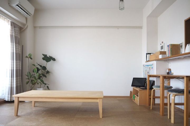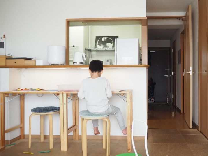 50㎡・2LDKマンションに家族5人で暮らしています。部屋数が限られるため、誰も個室を持っていません。おのずと大人も子どももリビングで勉強するようになりました。
