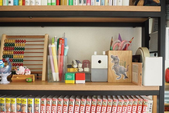 ドリル、参考書、ふだん使う文房具は、取り出しやすいリビングの一画にすべて置いています。これらは学習場所の変化に応じて置き場所を変えていくつもりです。