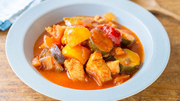 鶏むね肉は、片栗粉をまぶすことでやわらかく仕上がるのがポイント!ナス、タマネギ、ズッキーニ、パプリカといった夏野菜の豊かな風味が、トマトの水煮とともに絶妙に絡み合い、シンプルながらも満足感のある味わいです。