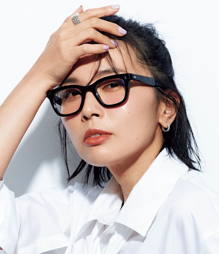 メガネ¥29,700(キュービッツ/ブリンク 外苑前)シャツ¥8,690(リリアン カラット)ピアス¥16,500リング¥41,800(ともにウノアエレシルバーコレクション/ウノアエレ ジャパン)