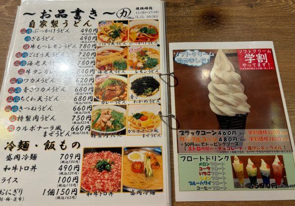 昼の訪問で、夜営業のメニューも注文OK!うどん職人さんが居る時は可能な時もあるようですが、夜に手打ちうどんはやってませ~ん!!ということで、お昼に行くとお得感♪ さらには、学生さ~ん!にお得な学割メニューもあるので活用くださいね♪