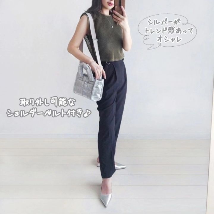 トレンド感あふれるシルバーのパフミニショルダーバッグは、シンプルコーデにアクセントを与えてくれます。パンプスも同じくシルバーでそろえて、モードな大人女子コーデを楽しんでみてはいかが?中綿がしっかり入っていてボリューム感があり、持ち手もしっかりしているため安っぽく見えないのもうれしい♡