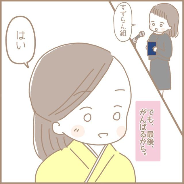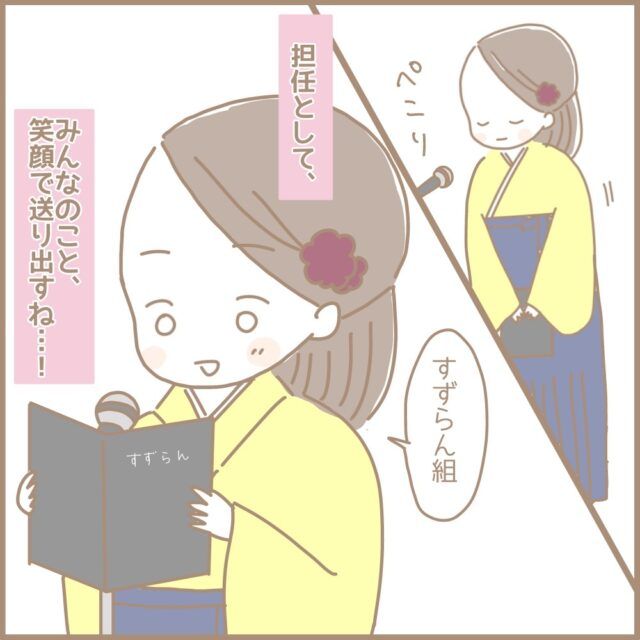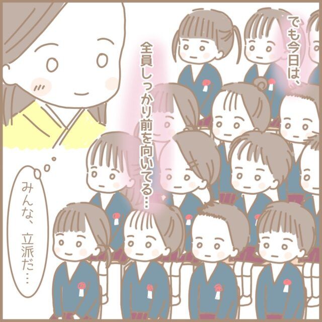 またしても涙腺崩壊寸前だったまるちゃんさん、何とか堪えていたところ、笑顔で怒りのオーラを放つ理事長先生が目の前に!理事長先生の無言の圧のおかげで血の気も涙も引き、冷静さを取り戻してきました。気持ちが落ち着くと子ども達の様子が気になったまるちゃんさんが子ども達を見ると、すごく真剣な表情で着席している子ども達の姿が見えました。名前を呼ばれるまで待ち時間が長いまるちゃんさんのクラスの子ども達、いつもは途中で集中が切れてしまっていたけれど、今日は全員しっかり前を向いている「みんな、立派だ・・」と感じたまるちゃんさんは「私も最後はがんばるから。担任としての最後の仕事、しっかりやるね。みんなのこと、笑顔で送り出すね」そう心に誓いすずらん組の子ども達の名前を読み上げる為、マイクの前に立ちました。