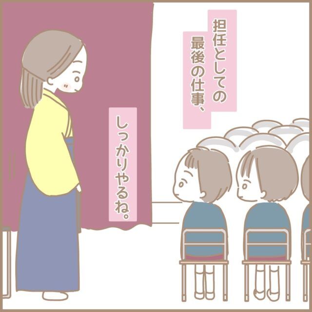 卒園式直前に保護者からの感謝の手紙を読んで涙腺が崩壊してしまったまるちゃんさん、その後気を引き締めて会場に向かいますが、入場しながら自然と涙が!再び崩壊してしまったまるちゃんさんの涙腺。そのとき、笑顔で怒りのオーラを放つ理事長先生と目が合いました。「年長担任は卒園式で泣いてはいけない」と語っていた理事長先生、その無言の圧を感じてサーッと血の気が引いて涙も引っ込んだまるちゃんさん、その後気持ちが落ち着き、子ども達のことが気になってきました。