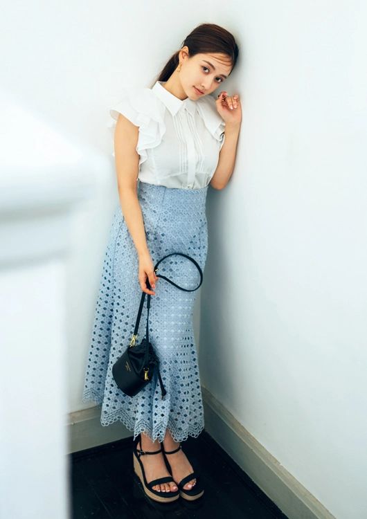 レースマーメイドスカート¥24,200/CELFORD ルミネ新宿2店 フリルブラウス¥12,980/LILY BROWN(LILY BROWN ルミネエスト新宿店) ピアス¥20,020、リング¥22,660/ともにソコ(ズットホリック) バッグ¥16,500/ジネス(ジオン商事) サンダル¥9,900/CHARLES & KEITH JAPAN