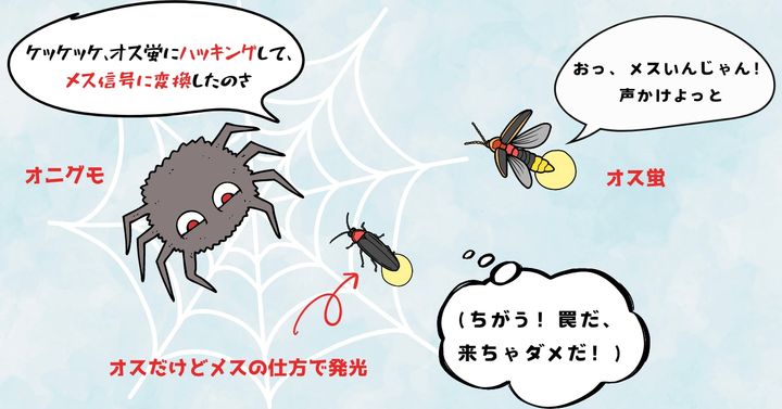 オニグモの巣に引っかかったオス蛍がなぜかメス蛍に特有の光信号を発していたのです。