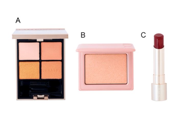 Bを頬骨高めにほんのりと。Cはブラシにとり、輪郭をきちんと縁取ってきちんと感と品のよさを演出。