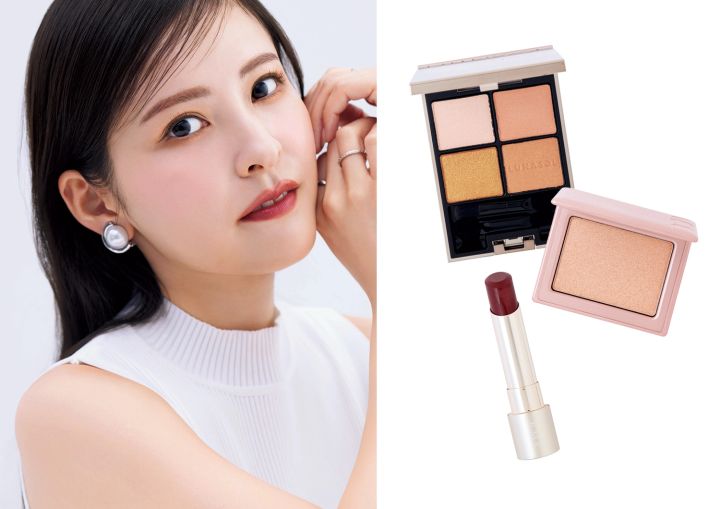 顔立ちがはっきりしている洋顔さんは、華やかなゴールドシャドウがお得意。アイホールと下まぶたになじませてリッチなツヤを仕込んで。ハイライトは頬骨に沿ってやや高めにオン。肌トーンがアップしているのでほんのりニュアンスをつけます。リップはモーヴブラウンでシック&女性らしく。