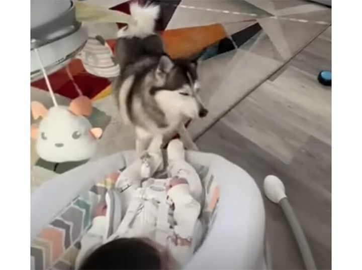 寝ている赤ちゃんを見守っている犬さんが…