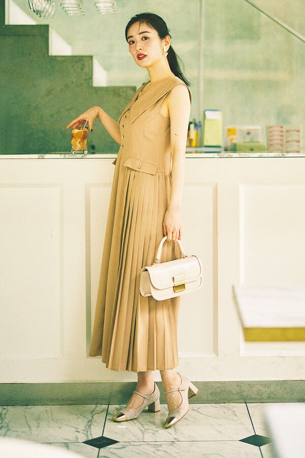 デザインもカラーリングもクラス感たっぷりなノースリワンピでドレスアップ。ハイソなエクリュの小物使いでワンピースの気品をさらに高めて。