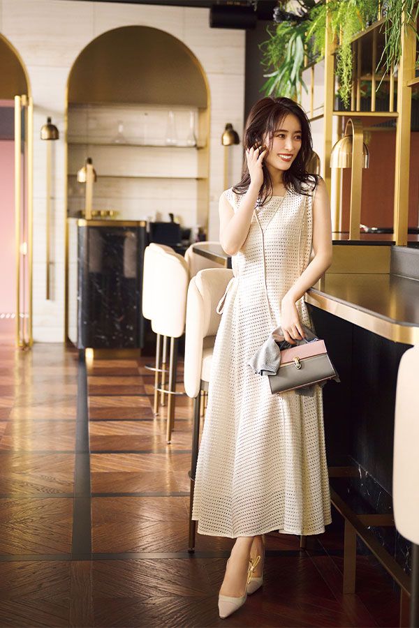 ノースリで腕を出し、さらにはメッシュ状の生地でほのかな肌見せも。シンプルな無地の白ワンピで清楚な令嬢を気取りながらも、どことなく色っぽさを感じる彼ウケ抜群な1着です。