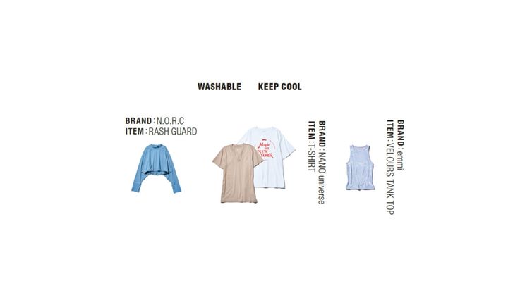 日差しや汗ジミを気にしてワードローブの幅をせばめないために、暑さ対策を完備したアイテムに目を向けるのもあり。接触冷感やUVカットなどの効果で、一日中キレイな体を保てる。