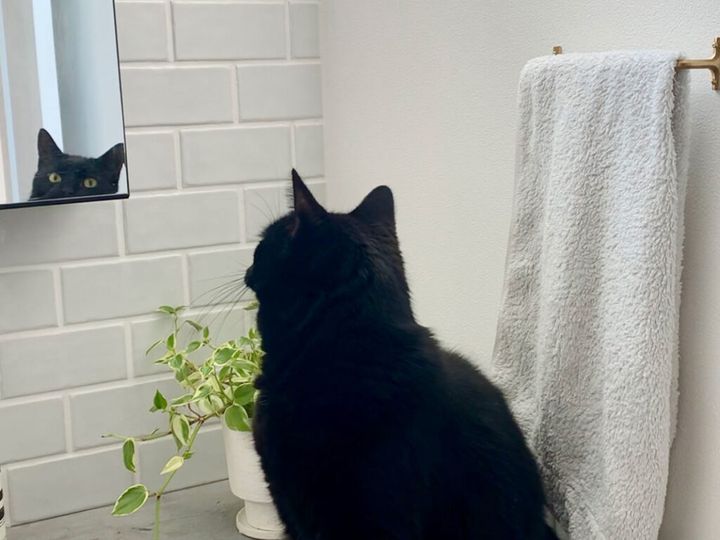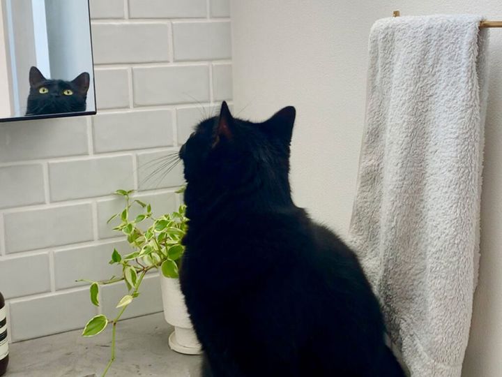 よし、これで今日もいい感じ! ね? 飼い主さん。(鏡越しでの会話)