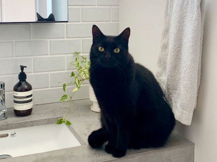 ギネスです。みなさんこんにちは。ここは2階の洗面所。ここはモルタルの洗面台がひんやりしていて、夏はとっても気持ちいいよ。