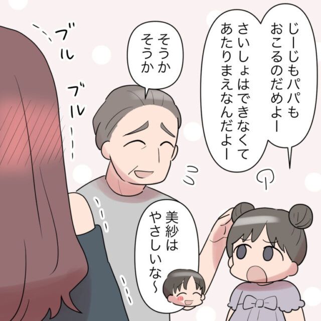 義父と夫に叱られて絶句する恵さんでしたが、それを見ていた美紗が「おこるのダメよー、さいしょはできなくてあたりまえなんだよー」と真剣に言うと、義父も夫もすぐにデレデレ。「そうかそうか」「美紗はやさしいなー」と目じりが下がります。無言の恵さんの肩は震えていました。
