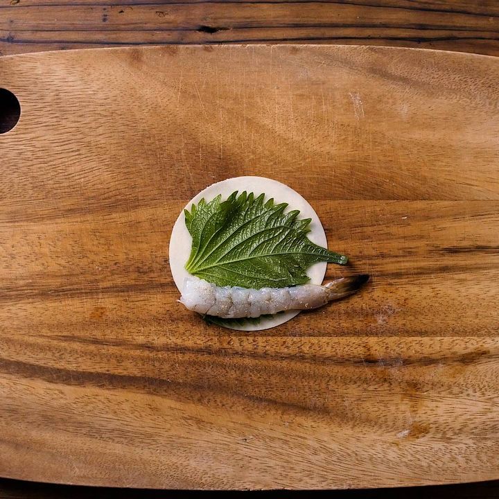4: 餃子の周りに水をつけて大葉、えびをのせて味付塩こしょうをかけます。端からくるくると巻きます。