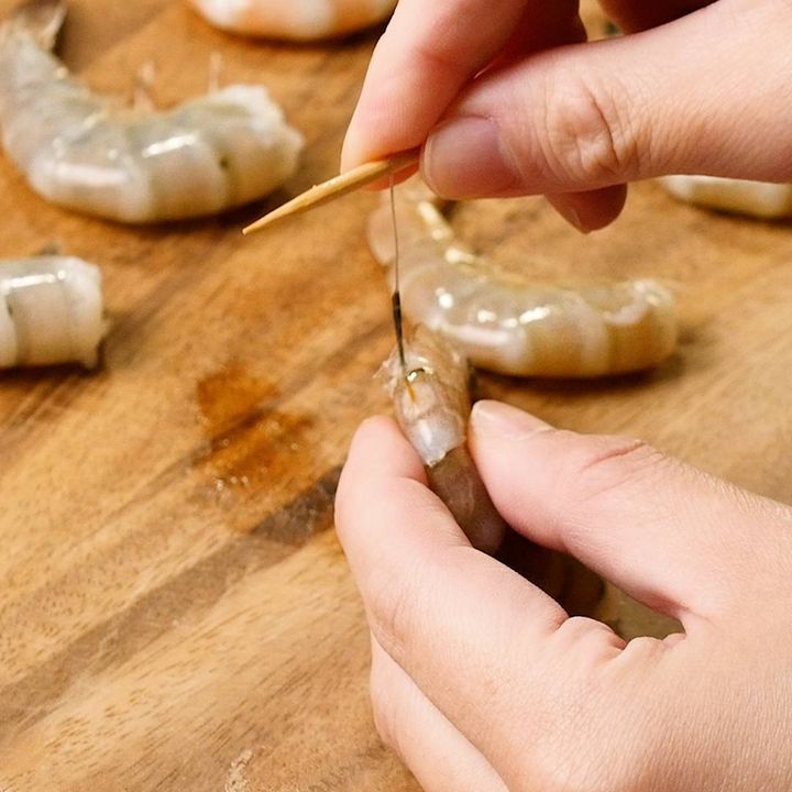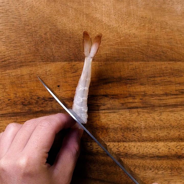 1: えびは殻と殻の間に竹串をさして背ワタを抜きとります。頭側から尾に近い一節を残して殻をむきます。