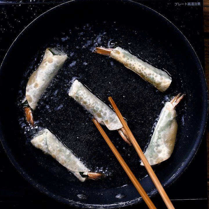 えびの尻尾に水が残っていると油はねする場合があるため、しっかりと水気をふいてください。