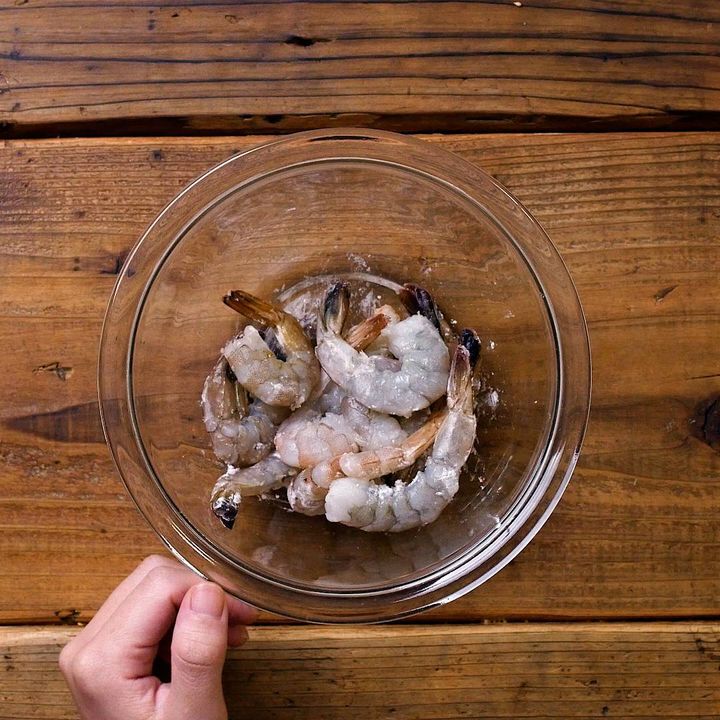 2: えびに片栗粉、塩をかけてもみこみます。流水で洗い流し、水気をふきとります。