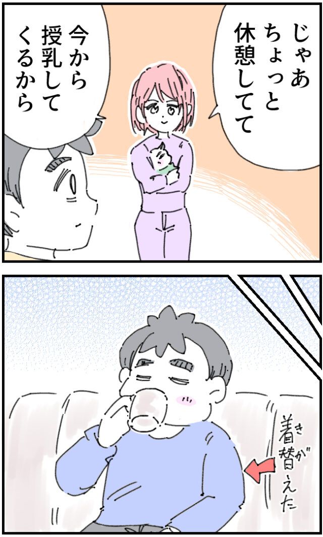 こはるちゃんをお風呂に入れ着替えさせようとしたところ、おしっこを飛ばされてしまったいちろうさん、その上こはるちゃんがオムツの中に気持ちよく排泄し全部やり直しに。その後やっとの思いでこはるちゃんの着替えを完了することができました。「ふぃ~今度こそ終わったぁ」としみじみしていると、「ご苦労様。授乳(ミルク)、着替え、寝かしつけ、遊び(お散歩)、お風呂、現状のこはるのお世話をひと通りやってもらったわ」とかおりさんが言いました。その後、授乳してくるから休憩しててと言われ、着替えてソファに座り込んだいちろうさんは、コーヒーを飲みながら「もし完全ワンオペだったらこんな休憩も無いんだよなぁ。かおり本当に大変だったんだ」あらためてかおりさんがどれだけ大変だったかを考えました。