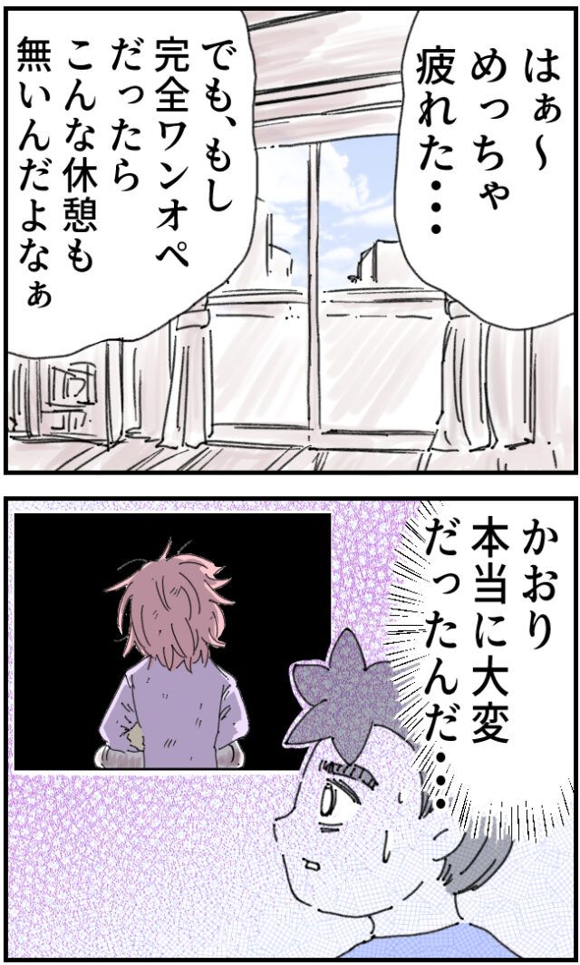 「はぁ~めっちゃ疲れた・・。でも、もし完全ワンオペだったら、こんな休憩もないんだよなぁ」そう思ったいちろうさんは「かおり、本当に大変だったんだ・・」あらためてかおりさんがどれだけ大変だったのかと痛感しました。