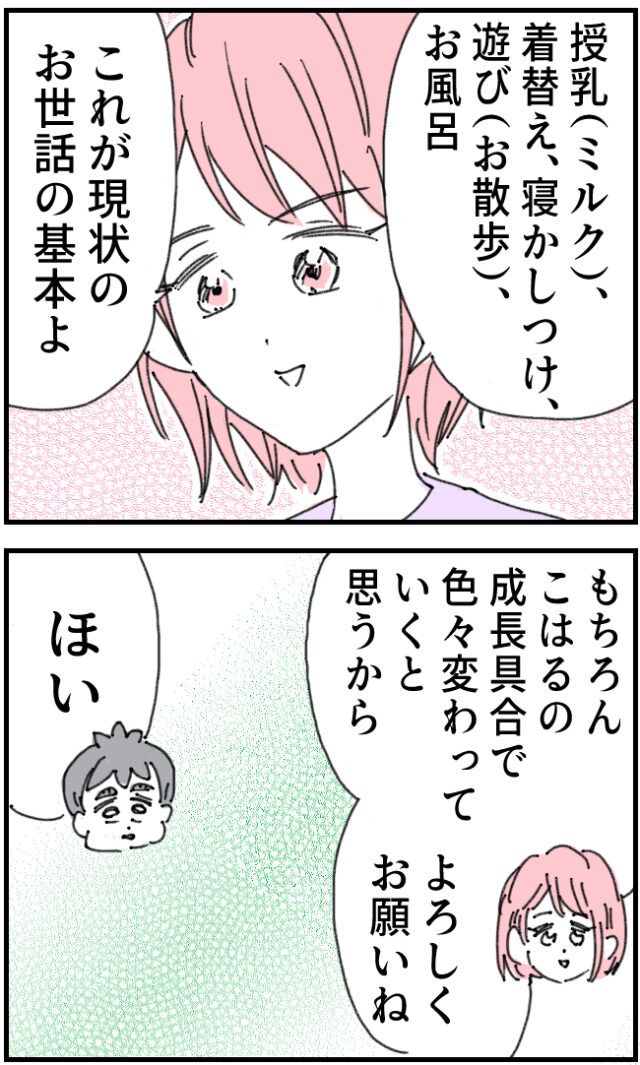 「授乳(ミルク)、着替え、寝かしつけ、遊び(お散歩)、お風呂・・これが現状のお世話の基本よ」とかおりさんは言った後で「もちろん、こはるの成長具合でいろいろ変わっていくと思うから、よろしくお願いね」かおりさんにそう言われて「ほい」いちろうさんは返事をしました。