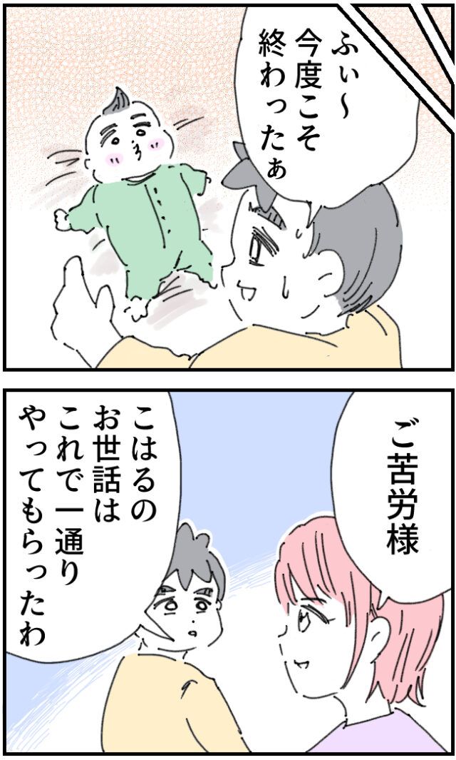 こはるちゃんを早く着替えさせようと急いでいたいちろうさん、なんとか着替えが完了しかけた時、こはるちゃんのお尻から気持ちよさそうな音が!泣く泣く全部やり直しになったものの、「ふぃ~今度こそ終わったぁ!」と安堵しました。すると「ご苦労様。こはるのお世話はこれでひと通りやってもらったわ」かおりさんが言いました。