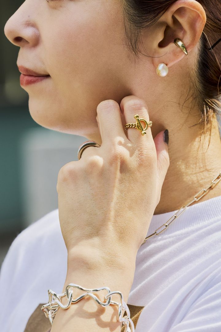 モードっぽくしたい時はシルバーでごつめなアクセサリーをセレクトします。