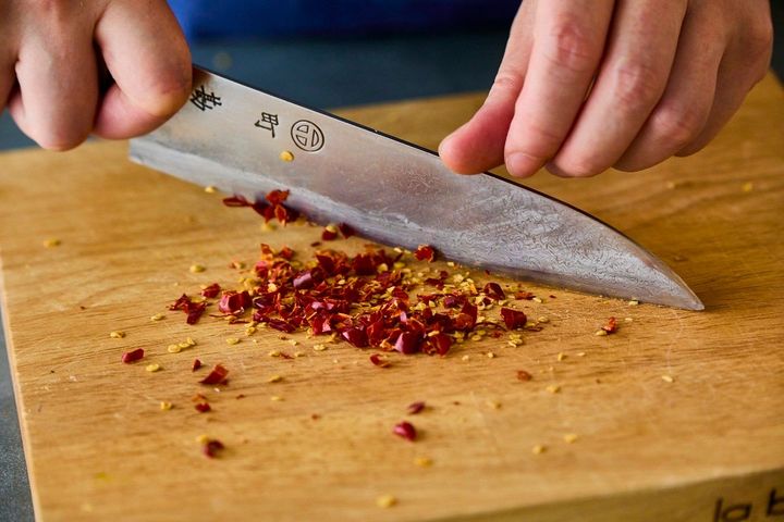 にんにくはみじん切りにする。赤唐辛子はへたを取り、種ごと粗く刻む。下味、煮汁の材料をそれぞれ混ぜる。