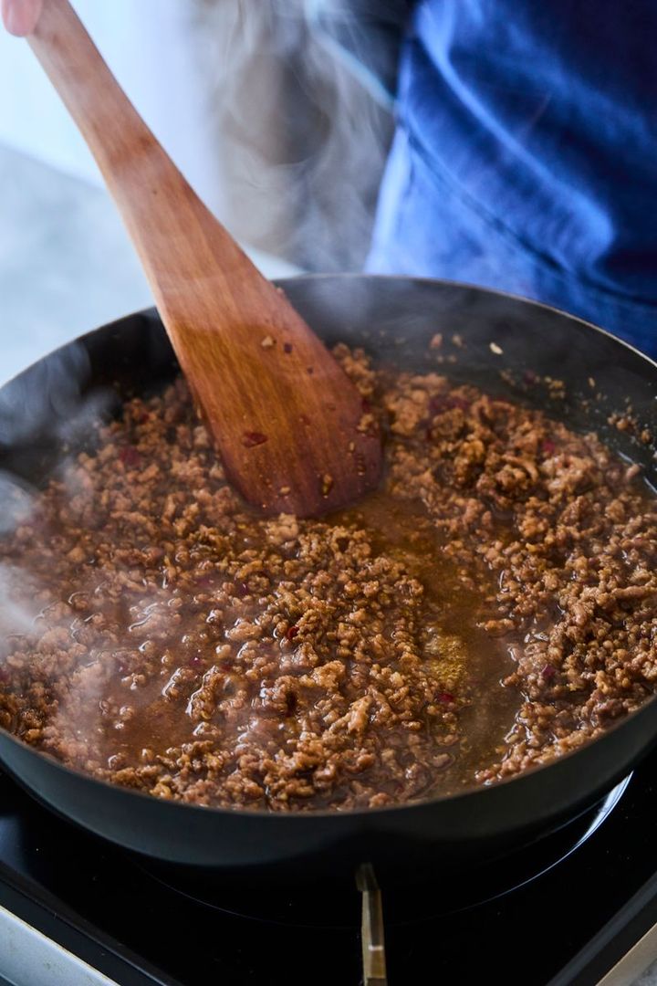 下味を加えて1 分ほど炒め、煮汁を加えて煮立たせる。アクを取ってふたをし、弱火で30 分ほど煮てざっと混ぜ、汁けがひき肉に少しかぶるくらい(写真参照)になったら火を止める。粗熱が取れたら汁ごと保存容器に移す。冷蔵で約1週間保存可能。