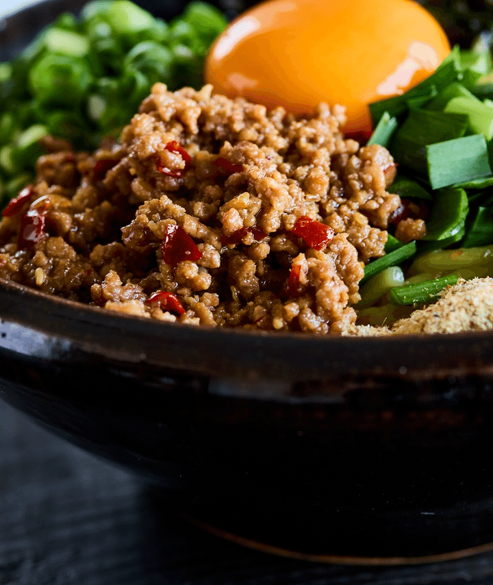名古屋発祥のご当地グルメ「台湾ラーメン」や「台湾混ぜそば」の具の要で、辛みとにんにくをきかせた肉そぼろのこと。パンチのある風味がくせになるおいしさで、お店ごとに味や辛みの個性はさまざま。
