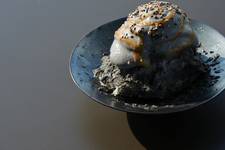 かき氷 黒胡麻 ¥1,800 白味噌と竹炭を使ったエスプーマが印象的なかき氷。黒胡麻のシロップがたっぷりとかかった、ごまの香ばしい香りと白味噌の塩味を楽しむ一品です。