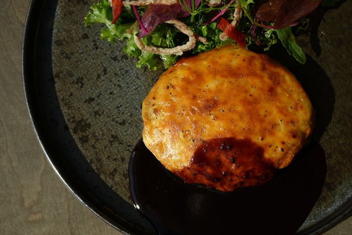 和牛 ハンバーグ ¥4,000和牛 ハンバーグは、エレガントな肉の旨味を最大限感じられるよう、味つけは玉ねぎと塩コショウのみで仕込んだシンプルで贅沢なパティ。チーズをのせて低温でじっくり焼き上げています。