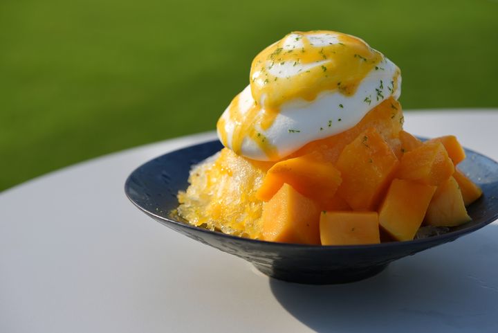 かき氷 宮崎県産マンゴー ¥3,200 宮崎県産の熟成したマンゴーを存分に堪能するかき氷。パッションフルーツの酸味や、ココナッツの風味も感じるトロピカルなテイストです。