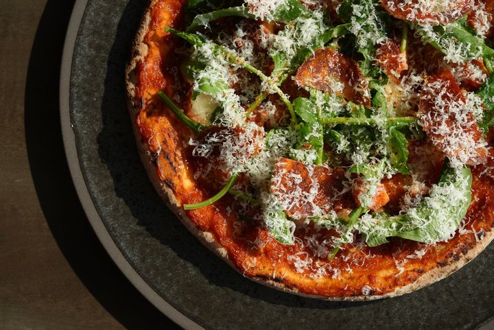 ピザ タコのプッタネスカ ¥2,800 パプリカと⽩ワインでマリネし、柔らかく煮込んだタコを楽しめるピザ。フレッシュトマトやケッパー・オリーブにふんだんに使⽤し、1枚ずつ丁寧に焼き上げていきます。