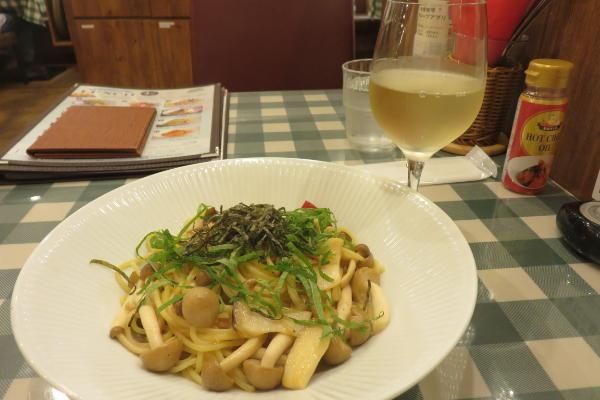 パスタは、女性が腹八分目になれる量で程良いボリュームでした。湯で加減が絶妙で、プリっと張りのある食感のパスタからは、前記の通り、お店のこだわりを感じました。予想外で嬉しかったのは、きのこが3種類も使われていた事です。「きのこパスタ」と言うと、しめじだけが使われているイメージだったのですが、こちらでは、えのきとエリンギも入っていました。えのきが旨味を加えてくれ、しめじとエリンギはコリコリとした食感で、食べ応えを演出してくれていました。総じて、美味しいパスタでした。 ワインはよく冷えており、程良い渋みがありつつも飲みやすく、夏の暑さを忘れさせてくれました。ティータイムに1人でゆっくり楽しむワインは、一層美味しかったです!