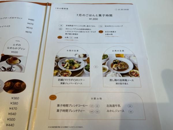 「ごはんと菓子時間」というランチメニューは、主菜をお肉か魚から選べるほか、本日の焼き菓子と飲み物が付いて1650円。