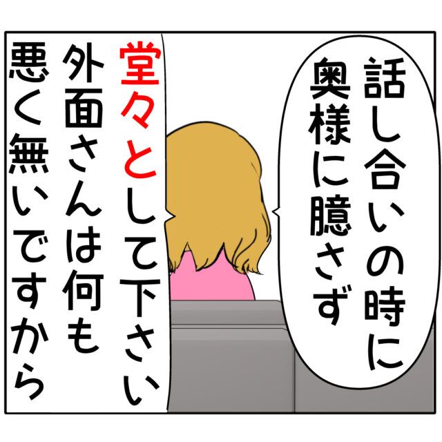 「話し合いの時に奥様に臆さず堂々としてください。外面さんは何も悪くないですから」悪いのはモラハラをしているすみれさんで、良し男さんは悪くないと繰り返すふり子さん。