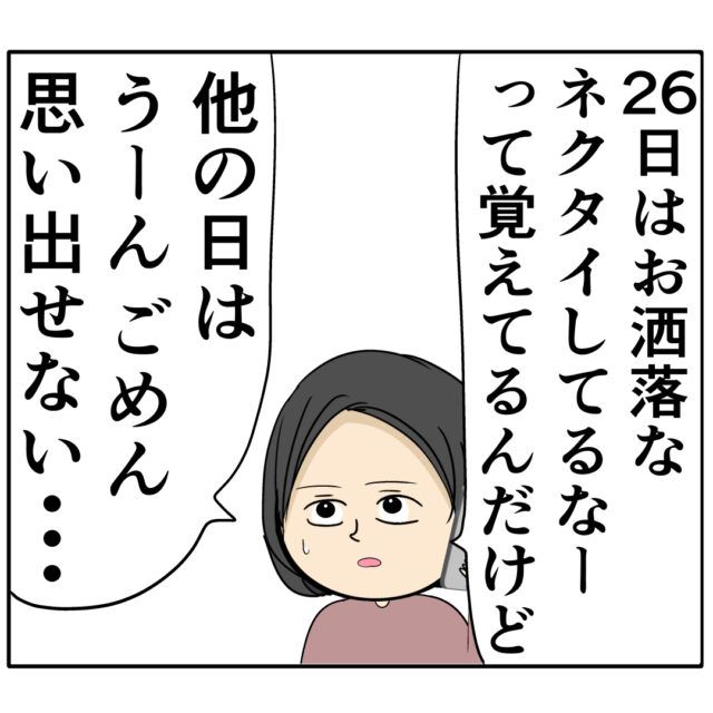 ランチ会があった26日以外で良し男さんがオシャレなネクタイをしていた日がないかすみれさんに聞かれたマキさんですが、思い出せません。
